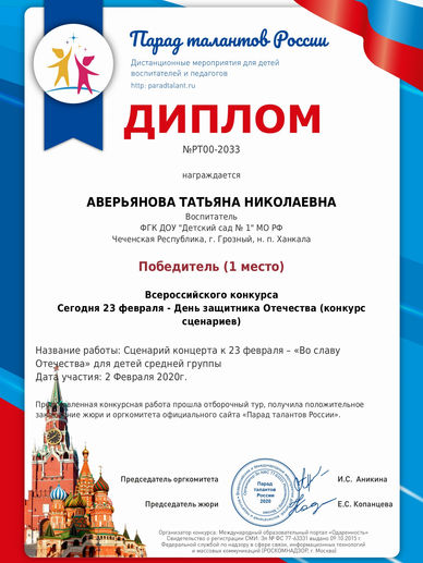 Диплом I степени Всероссийского конкурса «Сегодня 23 февраля – День Защитника отечества», 02 февраля 2020 год.